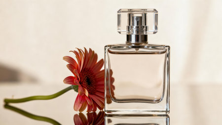 Close up view of a clear transparent cologne bottle with a cubed glass cap next to a vibrant coral-colored Gerbera daisy on a reflective surface against a soft, bright beige background.