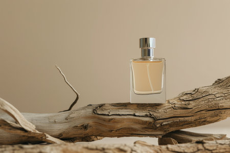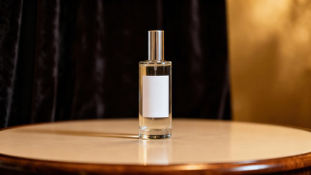 A glass bottle of perfume sitting on a table next to some other objects, AI