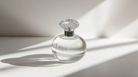 A beautifully designed clear glass perfume bottle showcased in soft light and shadows. Perfect for beauty, fragrance, or minimalistic design themes in photography.