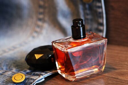 Bottle of perfume and headphones on the jeans, wooden background, brown color