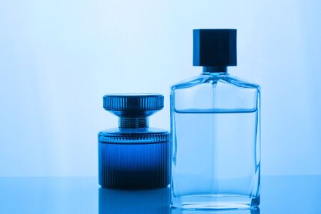 Women and man perfume bottle set on classic blue background with reflection. Aftershave, cologne. Selective focus