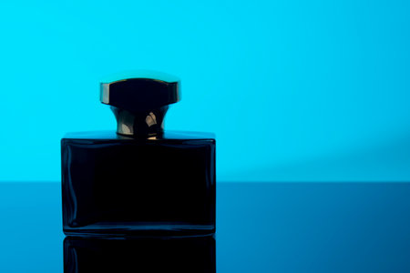 Black bottle of perfume on a blue background. Fragrance presentation with daylight. Trending concept with beautiful shadow. Womens and mens essence.