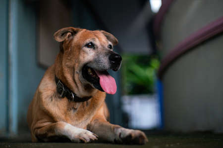 Happy stray dog. A dog with a protruding tongue is resting