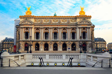 Front view of the Opera National de Paris. Grand Opera (Opera Garnier) is famous neo-baroque building in Paris. Designed by Charles Garnier in 1875.