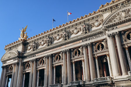 Paris, France - May 2, 2017: Beautiful architecture on the side of The of Opéra Garnier with blue sky background on May 2, 2017, in Paris, France.