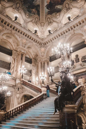 Paris, France - October 2017: The large ceremonial staircase of white, red and green marble divides into two divergent flights of stairs that lead to the Grand Foyer.