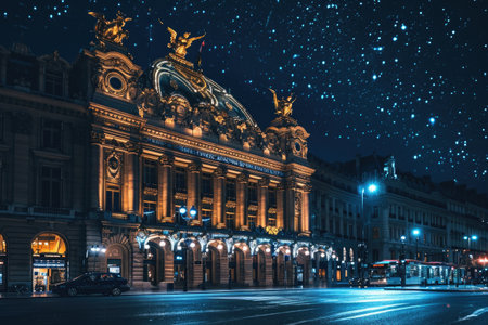 A building stands illuminated against a backdrop of countless stars in the night sky, An ornate opera house lit up under a starlit sky, AI Generated