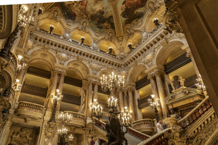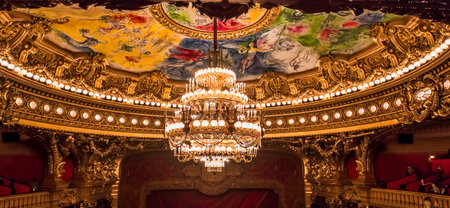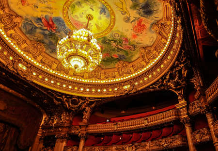Paris, France, July 12th, 2014. The opulent interior of Palais Garnier, with rooftop murals and crystal chandeliers.