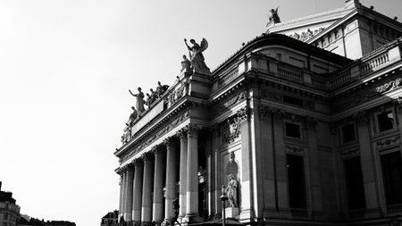 Facade showing grand neoclassical building facade with imposing columns statues and ornate architectural details in...