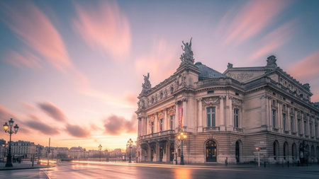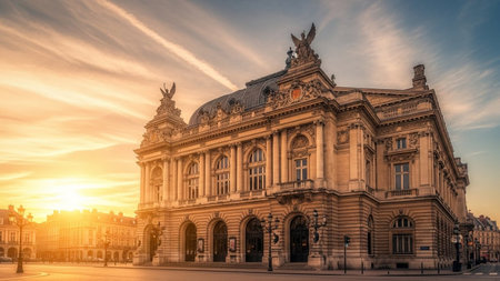 A grand opera house with ornate classical architecture bathed in the warm glow of a golden sunset.