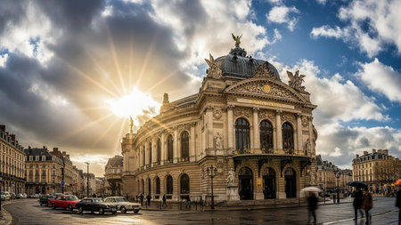 Dramatic showing grand opera house facade bathed in dramatic golden sun rays and dark stormy clouds overhead.