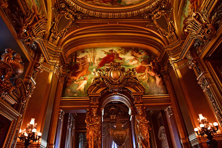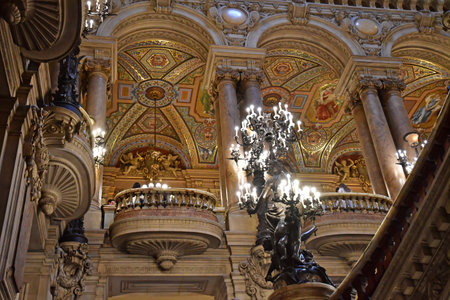 PARIS, FRANCE, MARCH 14, 2017 : interiors, frescoes and architectural details of the palais Garnier, Opera of Paris, march 14, 2017 in Paris, France.