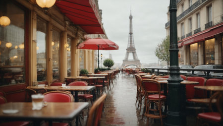 Wet Parisian Cozy Restaurant terrace with tables. Rainy Day Vibes in Heart of City , Grey Sky, and Eiffel Tower Silhouette Creating Timeless Scene of Urban Romance. Traveling in France concept.