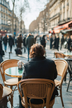 Writer finding inspiration watching pedestrians walking down busy street in paris, france
