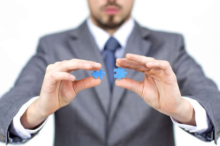 A businessman's hands joining the pieces of a jigsaw symbolizes the merging of two enterprises.