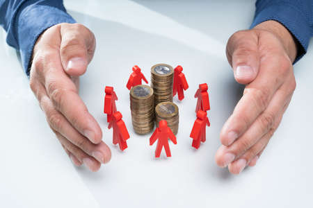 Close-up Of A Businessperson's Hand Protecting Stacked Coins Surrounded By Yellow Human Figures