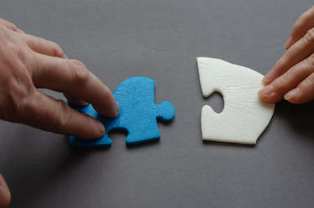 Mans and a womans hand connecting two puzzle pieces closeup. Resolution of family conflicts concept