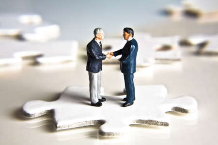 Miniature businessmen shaking hands on blurred group of jigsaw puzzle background. Concept of partnership successful.