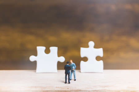 Hand holding the puzzles for the businessmen to work together as a team. Concept of planning work as a teamwork. Closeup of businesspeople holding jigsaw puzzle.