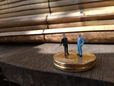 An equal pay concept. Miniature people sitting in the same height pile of coins Black Background