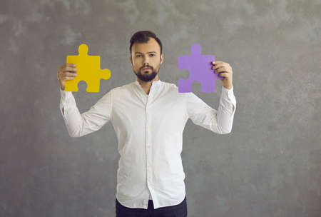 Portrait of serious young guy standing against grey studio background holding and joining two jigsaw puzzle pieces of yellow and purple color. Concept of finding good professional business solution