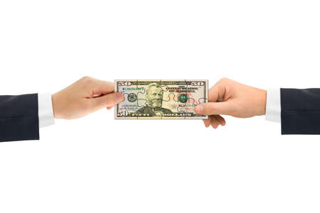 Two people are handing each other dollar bills, they are mutually beneficial business partners, they commit bribery fraud for business interests. The concept of corruption and bribery.