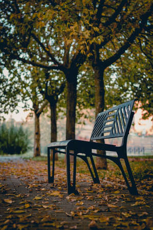 Metal bench in autumn park covered with foliage in rainy day