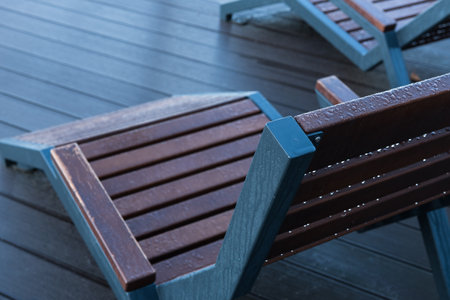 CITY PARK - Wooden loungers in the recreation area wet with morning dew