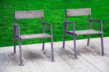 Wooden chairs in the park on a white wooden floor with green grass