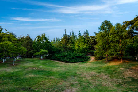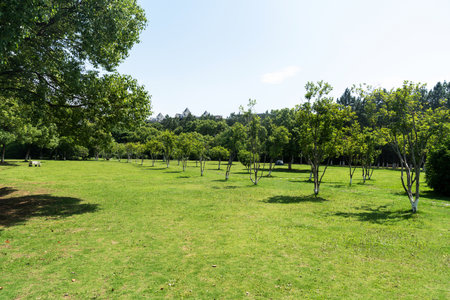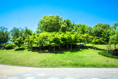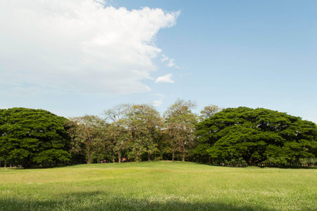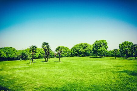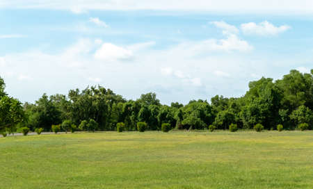 Landscape of grass field and green environment public park with blue sky. Beautiful summer landscape for background.