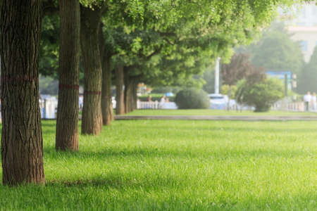 Photo of a beautiful green park with trees and grass on a summer sunny day
