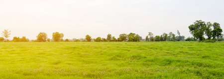 Beautiful green natural scenery background with morning sun and bright sky. concept of nature tranquility