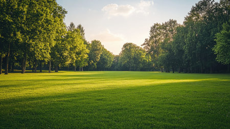 Lush green grass under warm sunlight with a distant lamppost in a tranquil park setting during late afternoon