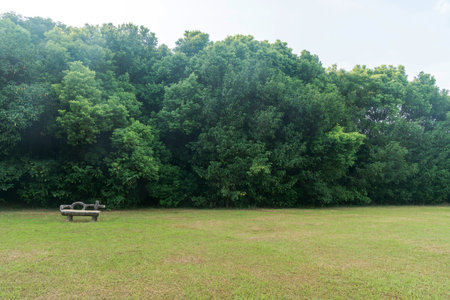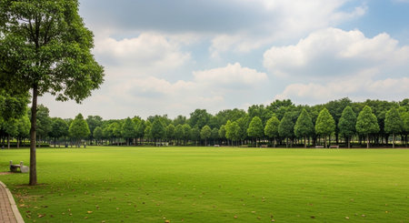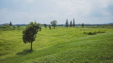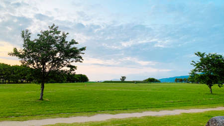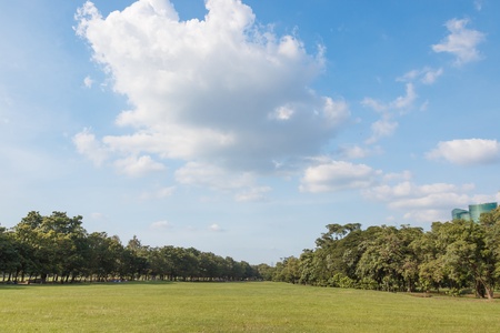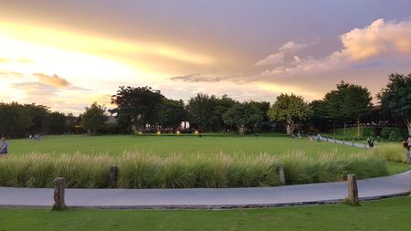 Green meadowgrass with tree in city park sunset sky nature in Bangkok Thailand