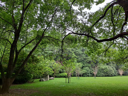 Green grass lawn and greenery trees, a pond and building on background under cloudy sky in garden of public park