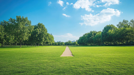 An open park with green grass and a clear path, leaving plenty of open space in the sky for text. -