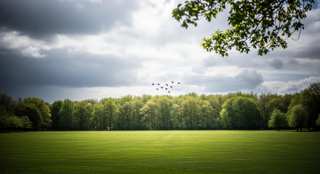 tranquil setting of a grassy meadow is characterized by its simplicity, purity, verdant carpet, gentle sway of grass, and unspoiled nature
