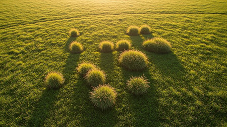 A high-angle view of a green field with distinct round clumps of grass casting long shadows in the warm, low sunlight.