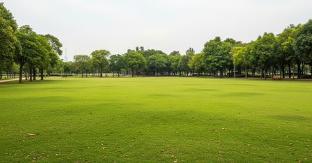 A serene park landscape featuring lush green grass and mature trees under a clear blue sky. Ideal for relaxation and enjoying nature's beauty.