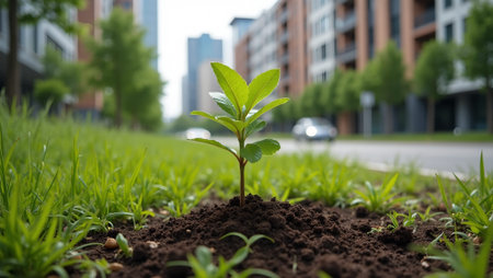 Green sprout growing from the ground in the city park. Concept of environmental protection.