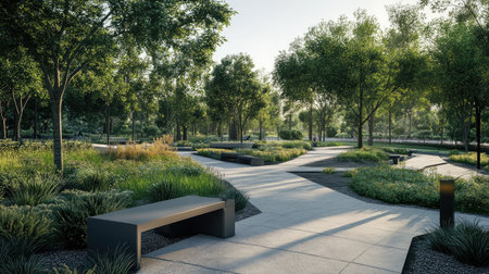 A modern public park with sleek benches, walking paths, and a mix of natural greenery and urban elements