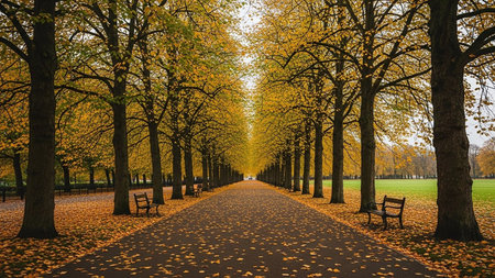 A serene autumnal scene of a pathway through a park with trees displaying vibrant orange leaves