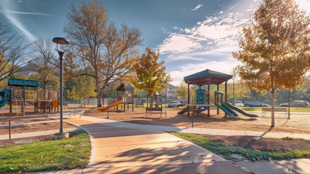 A serene playground scene features a shiny slide glistening in the golden sunset, framed by lush trees and a peaceful urban park atmosphere, inviting joy and exploration.