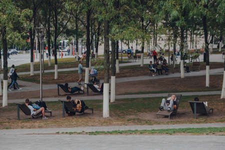 Brussels, Belgium - August 16, 2019: High angle view of people relaxing on public loungers in Brussels, the capital of Belgium and a popular city break destination.
