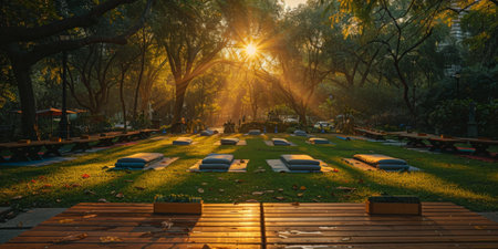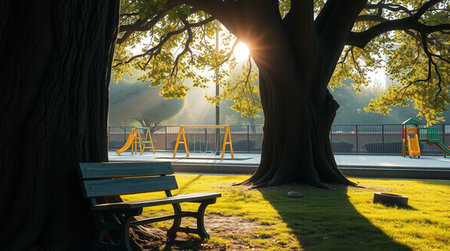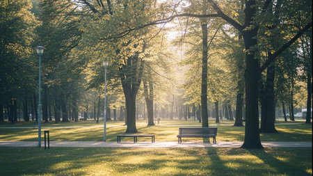 Sunlight filters through lush green trees in a calm park, with benches along the pathways creating a peaceful atmosphere