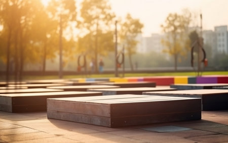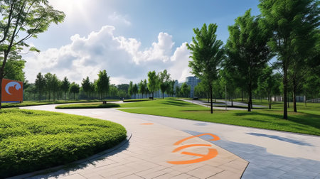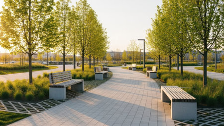 Modern city park. Wide paved pathways. Numerous park benches. Lush green trees. Warm evening sunlight. Beautiful landscape. Urban planning. Public space. Tranquil environment. Contemporary architecture. Recreational area. Outdoor leisure. Serene atmosphere.