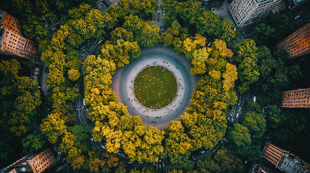 An aerial shot captures a circular park filled with people relaxing on the grass, encircled by vibrant trees and urban buildings, creating a serene oasis in the city.