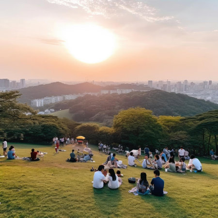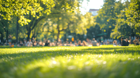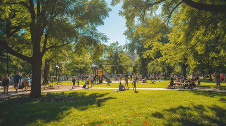 People of all ages enjoy a sunny day in the city park, engaging in picnics, games, and vibrant social gatherings, creating a lively outdoor atmosphere.