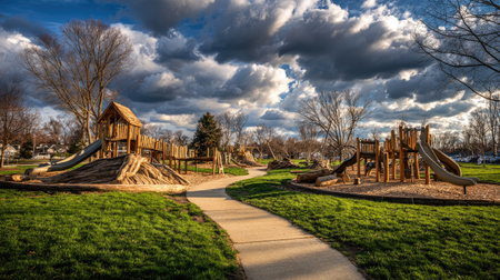 An outdoor playground features wooden structures with slides and pathways, set against a backdrop of green grass and a cloudy sky. The composition emphasizes the natural elements and recreational structures. This image could be used for various commercial or editorial purposes, showcasing outdoor recreation and leisure activities.