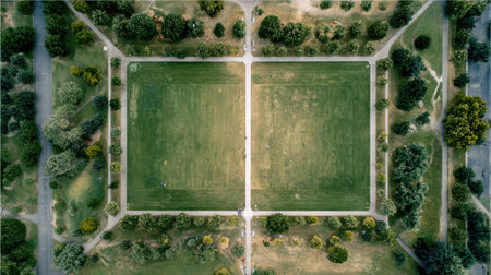 Drone perspective looking straight down on a large, perfectly empty rectangular park grassland, bordered by walking paths and trees. Geometric nature.